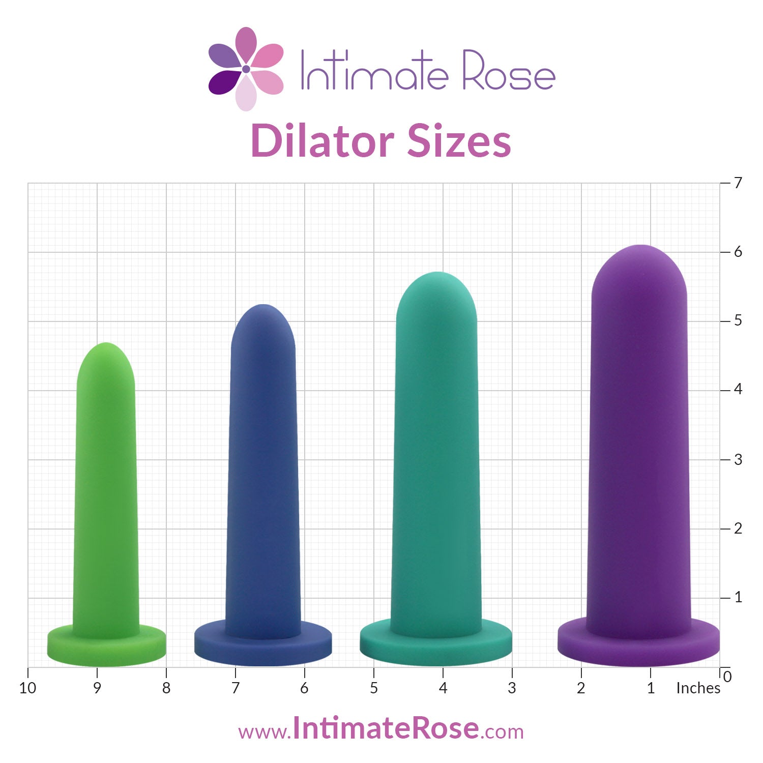 - 4 progressive sizes of our high-quality, medical-grade silicone dilators for pelvic pain symptoms related to vaginismus ranging in length from 5.0'' to 6.5'' (12.7cm to 16.5cm) and width from 1.0'' to 1.5'' (2.5 cm to 3.8 cm)