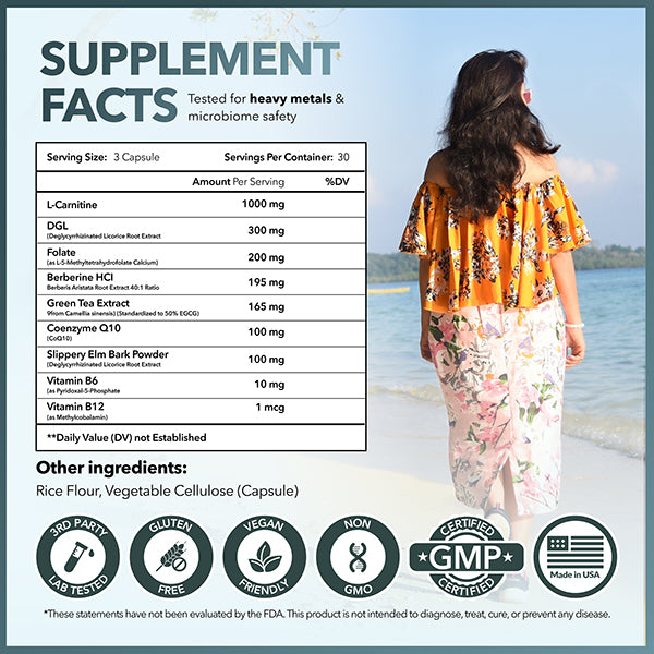 Ingredients: our formula combines Berberine HCL and Green Tea Extract - enhanced with essential nutrients like L-Carnitine, DGL, Folate, Slippery Elm Bark Powder, Vitamin B6 and B12 to support metabolism, energy, and digestion.