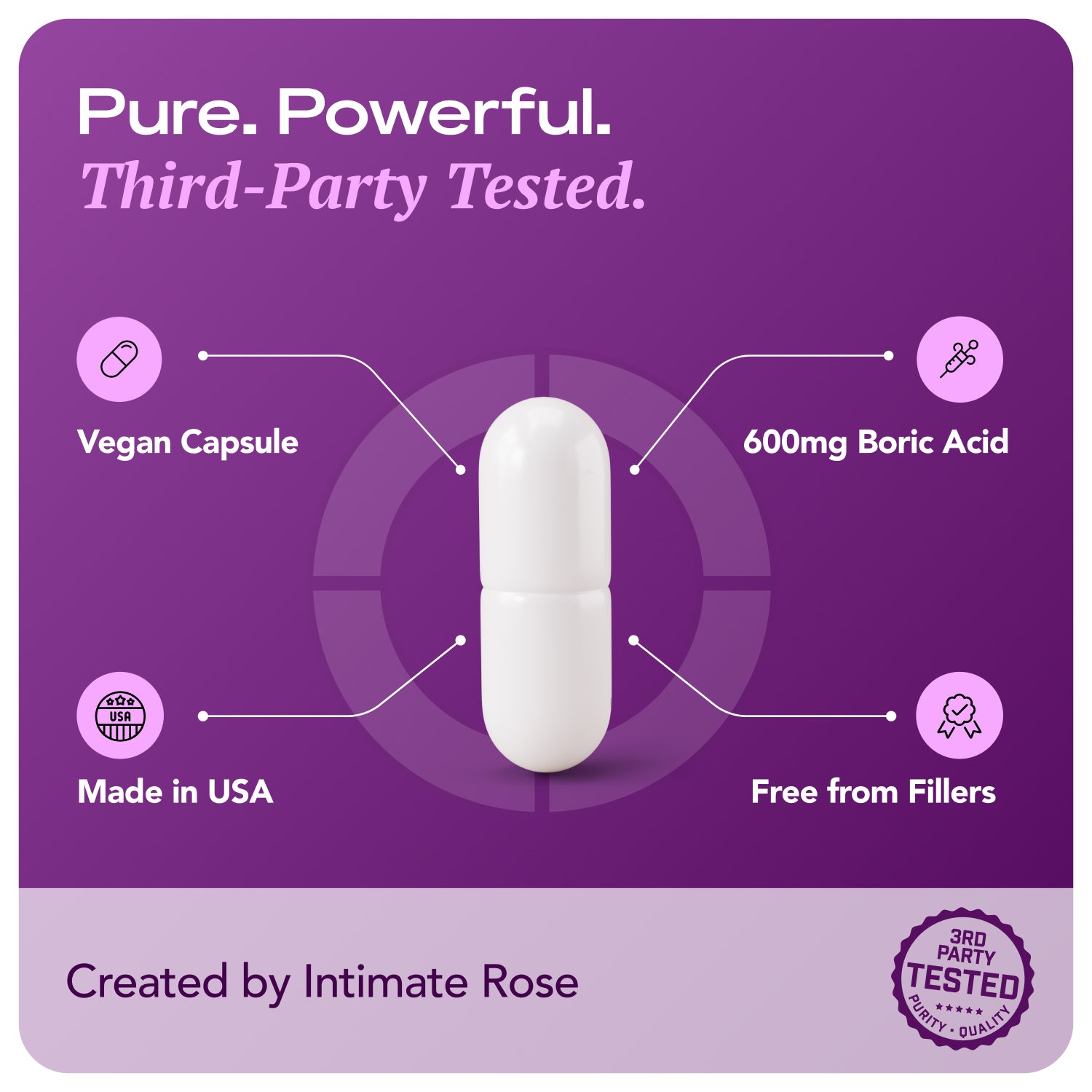Our 100% natural Boric Balance is considered gentle and effective for odor and irritation down there. It contains zero fillers or additives and are in our fast-acting vegan capsules. For best results: